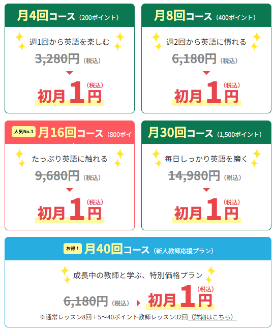 また、有料プランの申し込み時に不定期のキャンペーンを実施している場合(初月の受講料が半額になるなど割引がされる場合)は、最もポイント数の多い月30回プラン(12,980円)で契約するのがお得です!