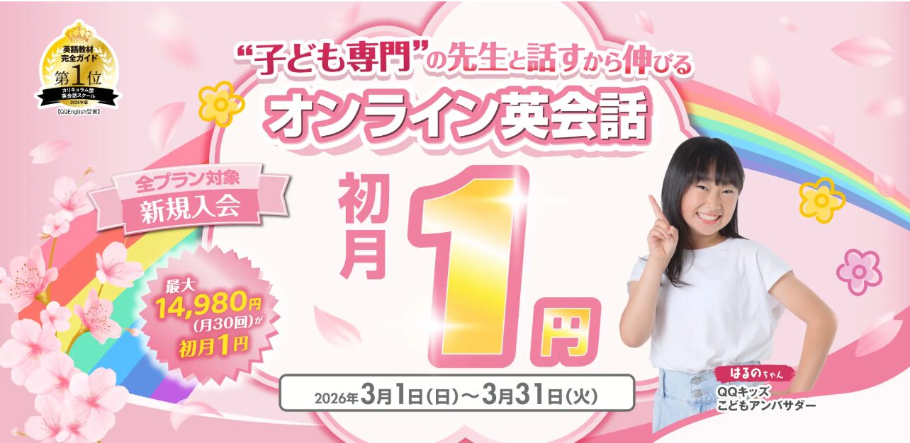 | 対象者 | ・2026年3月1日~2026年3月31日の間に新規でQQキッズに入会した方 ・当サイト内のリンクまたはリンクボタンから公式サイトに遷移しクーポンコード入力の上で無料体験レッスンを申し込んだ方 ※過去に入会歴のある方は対象外 |