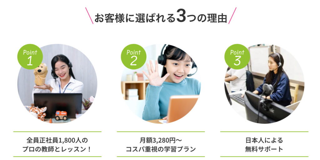子供専門カリキュラムがあることや講師の質はもちろんですが、②の内容が幼稚すぎないこともポイント。
