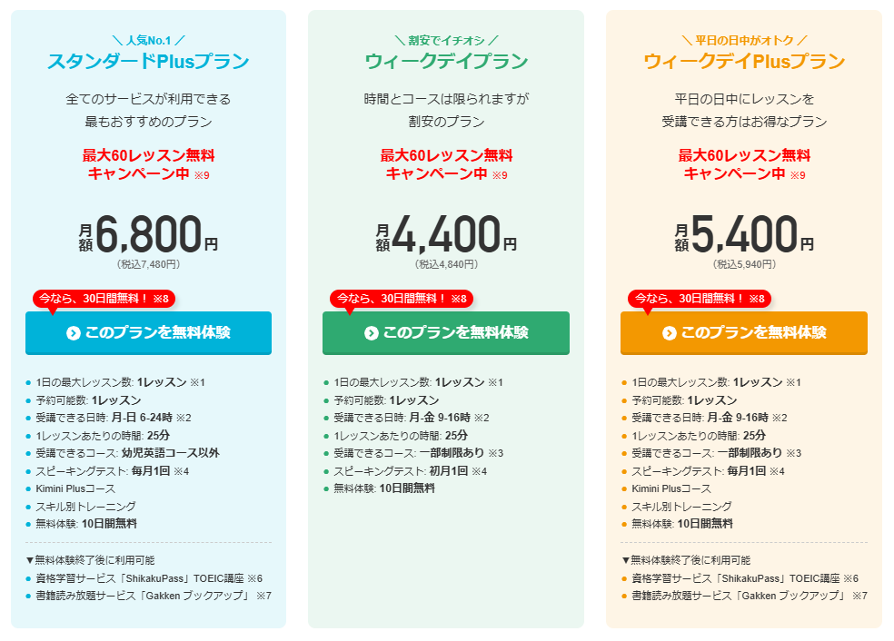 | 対象者 | 【無料体験30日間に増量】 2025年10月21日~10月27日までの間に、スタンダードPlusプラン、ウィークデイプラン、ウィークデイPlusプランで新規無料会員登録をした方 ※過去に入会歴のある方は対象外 【通常1日1回のレッスンが2回受講できる!】 2025年10月21日~10月27日までの間に、スタンダードPlusプラン、ウィークデイプラン、ウィークデイPlusプランで新規会員登録した方 ※過去に入会歴のある方(休会中の方)も休会から3ヶ月以上経過していれば対象! ※詳しくはkimini英会話 |