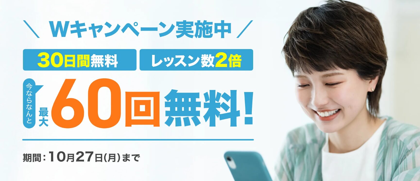 | 詳細 | ・対象プランのレッスンが期間中、30日間無料で体験できます。(通常は10日間) ・30日間の無料体験期間に解約した場合は一切費用はかかりません。 ・通常1日1回のレッスン受講権が1日2回受講できるようになります!(最大60回無料) |