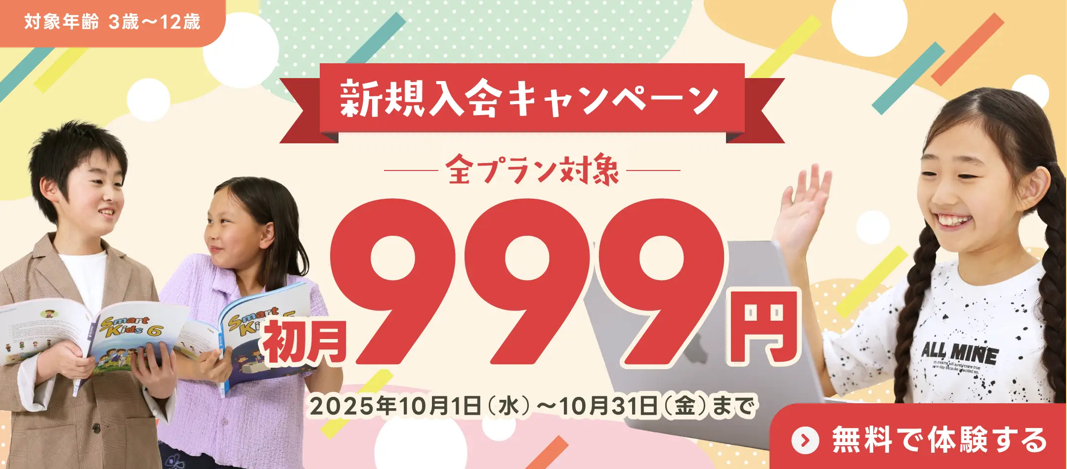 対象者 | ・2025年10月1日~10月31日の間に新規でQQキッズに入会した方 ・当サイト内のリンクまたはリンクボタンから公式サイトに遷移しクーポンコード入力の上で無料体験レッスンを申し込んだ方 ※過去に入会歴のある方は対象外 |