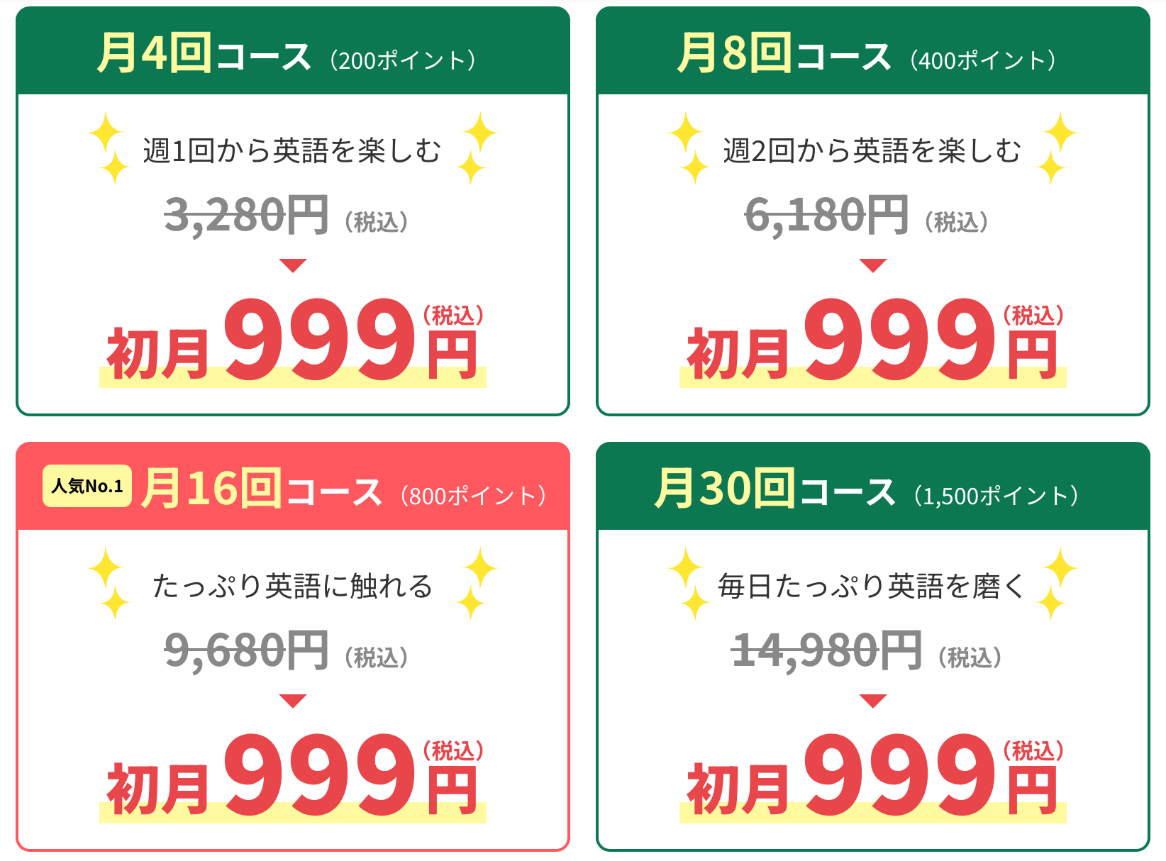 料金/コース | ・月4回:3,280円(200P) ・月8回:6,180円(400P) ・月16回:9,680円(800P) ・月30回:14,980円(1,500P) ※2025年10月の値上げ後最新料金 |
