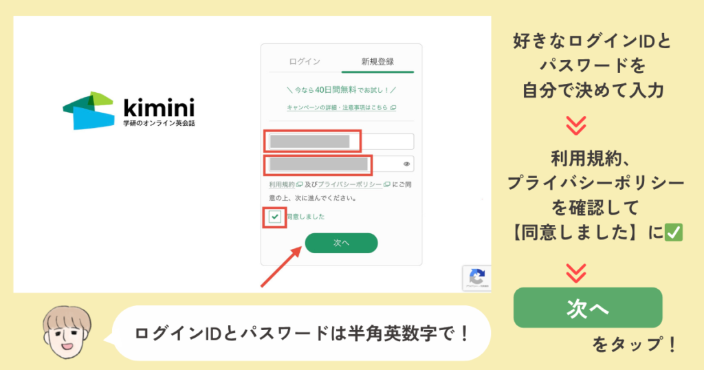 お好きなログインIDとパスワードを決めて入力したら、「同意しました」にチェックを入れて次へをタップします。