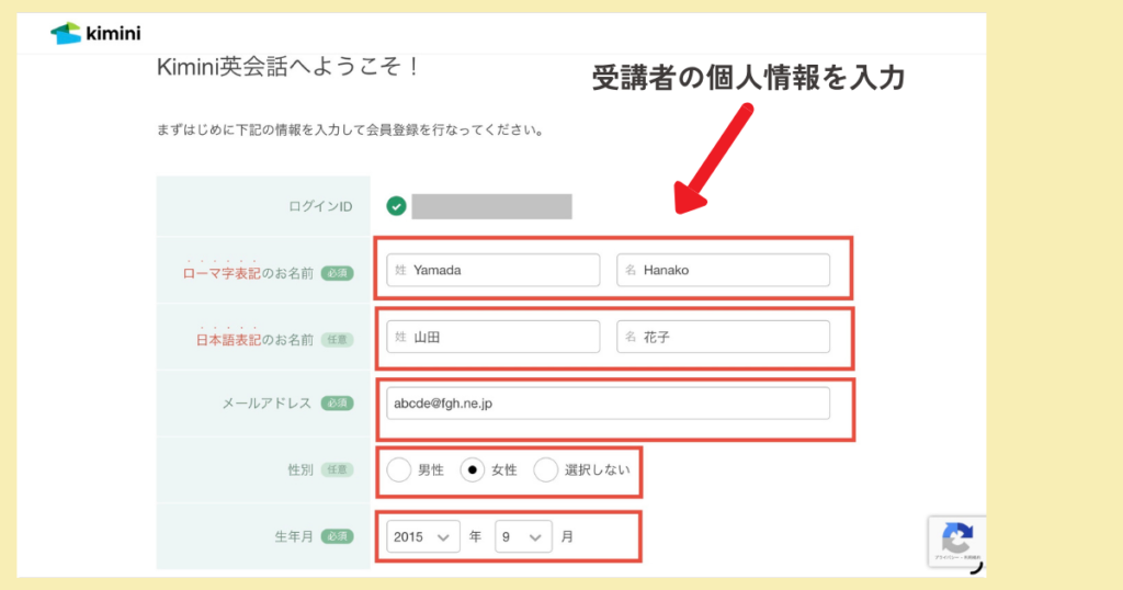 受講するのがお子様の場合は、お子様の名前・性別・生年月を入力してください