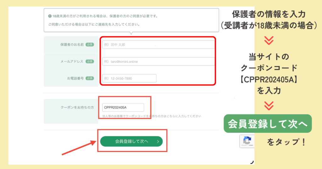 受講者が18歳未満の場合は、保護者情報の入力欄が表示されるので入力します。