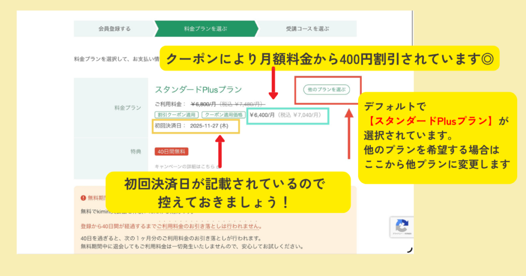 他のプランに変更もできますが、スタンダードPlusプラン以外を選択すると無料体験期間が10日間になってしまうので、ひとまずは【スタンダードPlusプラン】のままにしておくことをおススメします!