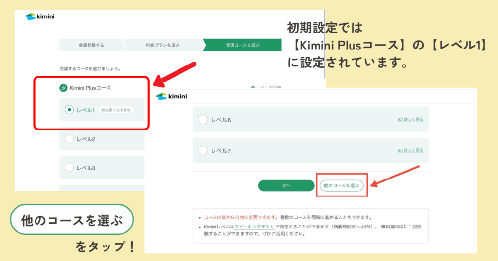 初期設定では【Kimini Plusコース】の【レベル1】に設定されています。