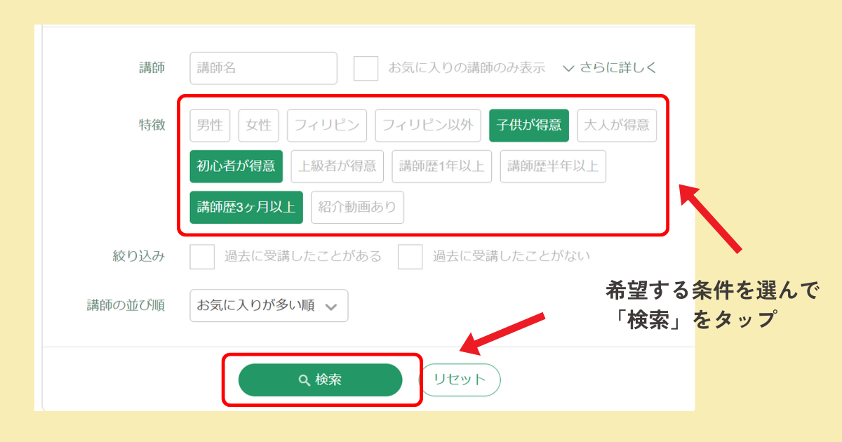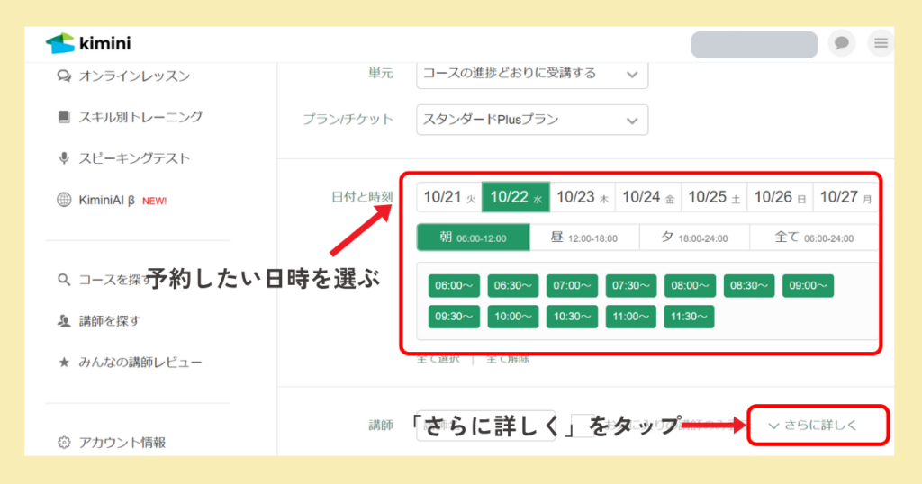 レッスンを予約したい日時を選んだら、「さらに詳しく」をタップし、より詳しい特徴をしぼって検索します。