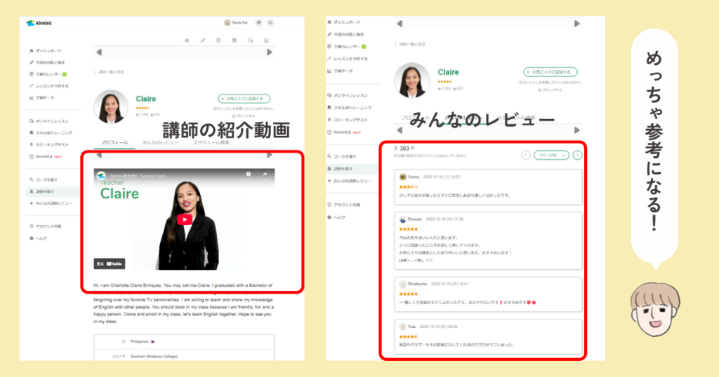 それぞれの講師アイコンをタップすると、講師の紹介動画や詳しいプロフィール、みんなのレビュー(受講者が投稿した講師の感想)をチェックすることができます!