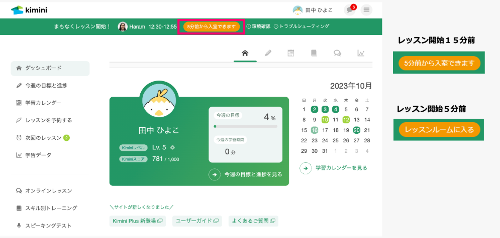 レッスン開始時間の5分前になったら、ページ上部のオレンジ色ボタンの表記が「レッスンルームに入る」に変わります。