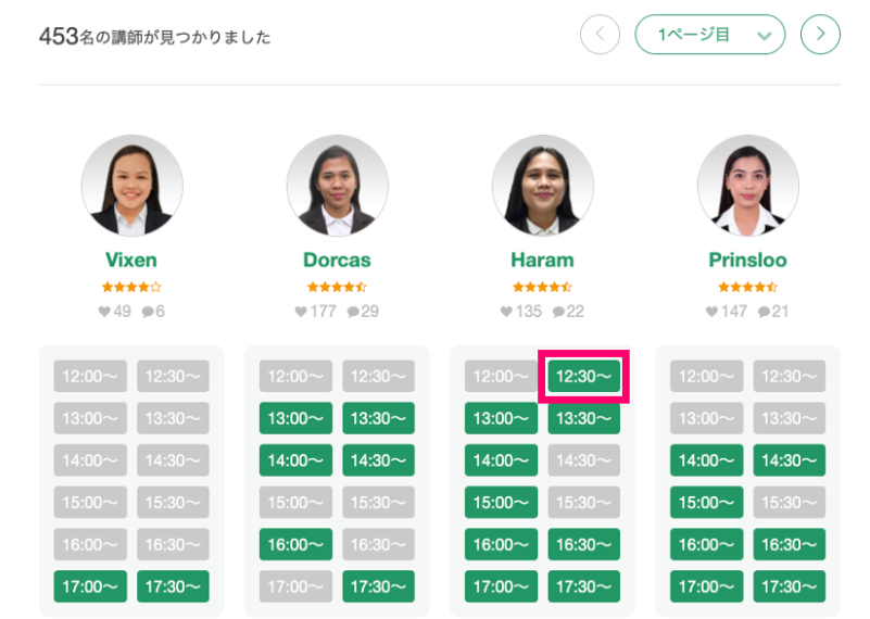 検索結果では、条件を満たした講師が一覧で出てくるので予約したい講師のレッスン枠(緑色)をタップして予約完了です!
