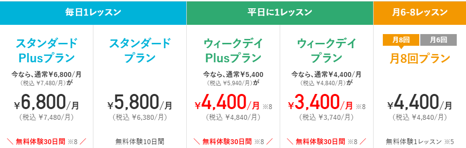 | スタンダードプラン | 6,380円 | 毎日1レッスン | コスパ重視。主要コースがほぼすべて利用可能 |