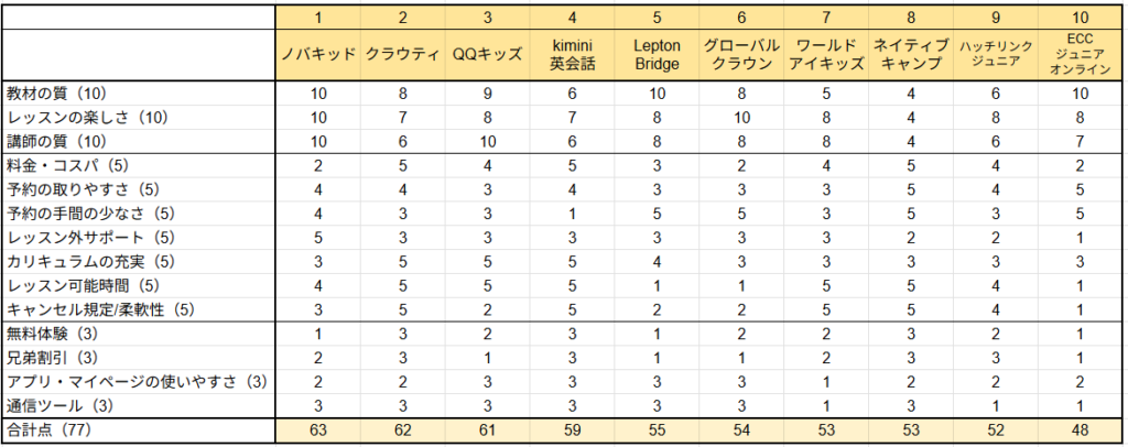 また、公平にランキングするため、保護者がオンライン英会話スクールを検討する時に重視するポイント10項目について客観的に点数化しています。